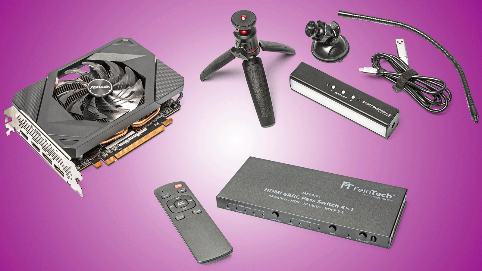 Videoleuchte mit App-Steuerung von German Light Products, eine kompakte Spielergrafikkarte im Mini-ITX-Format von Asrock und HDMI-Audio-Extractor von FeinTech.