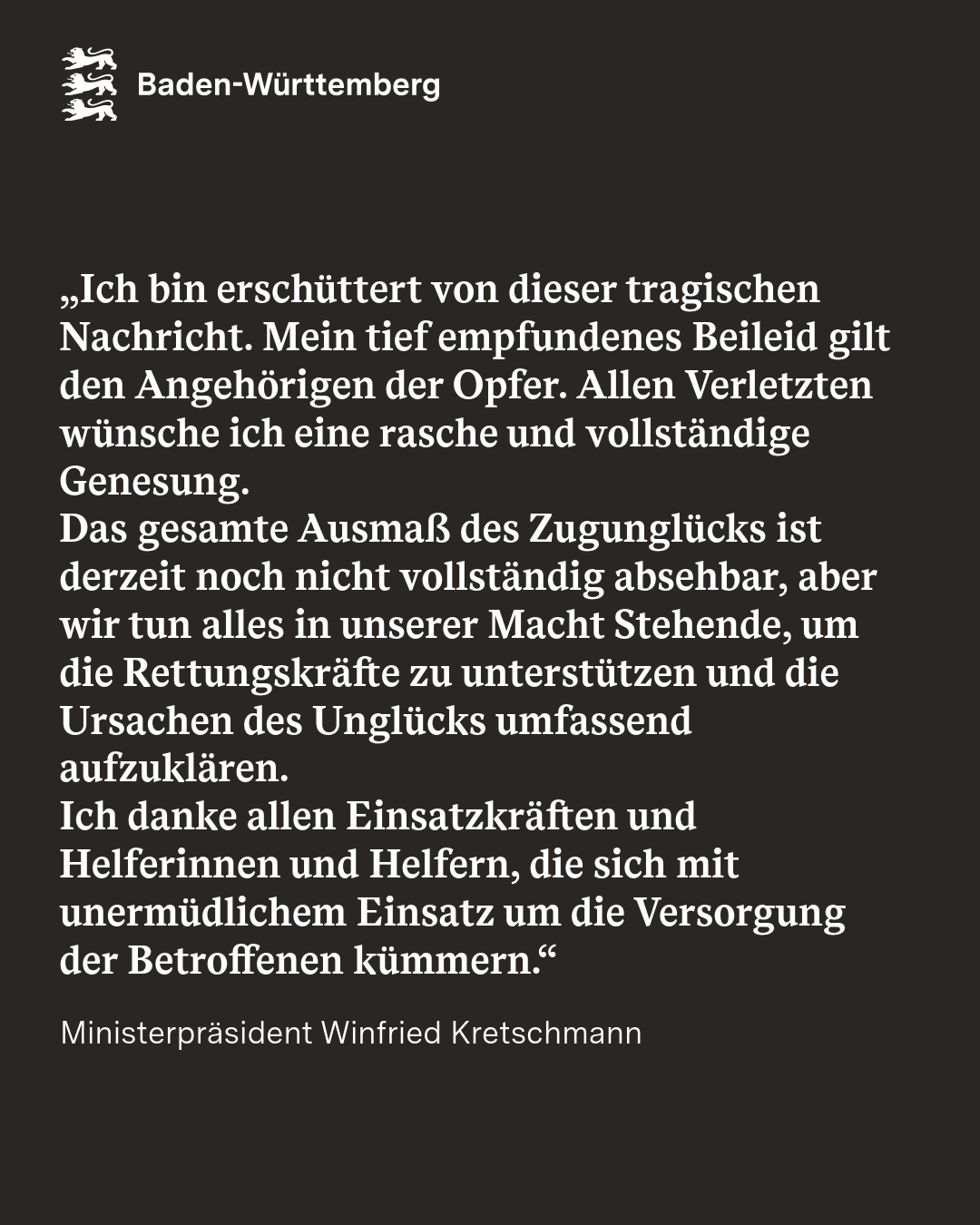 „Ich bin erschüttert von dieser tragischen Nachricht. Mein tief empfundenes Beileid gilt den Angehörigen der Opfer.“ - Ministerpräsident Winfried #Kretschmann nach dem schweren #Zugunglück bei #Riedlingen